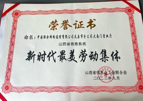 太原联通大南门营业厅荣获“新时代最美劳动集体”的称号