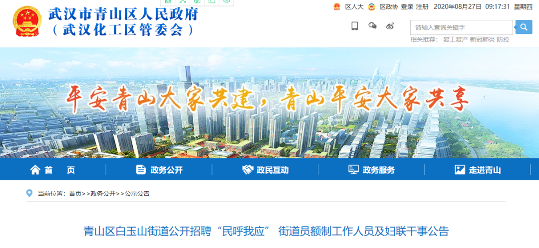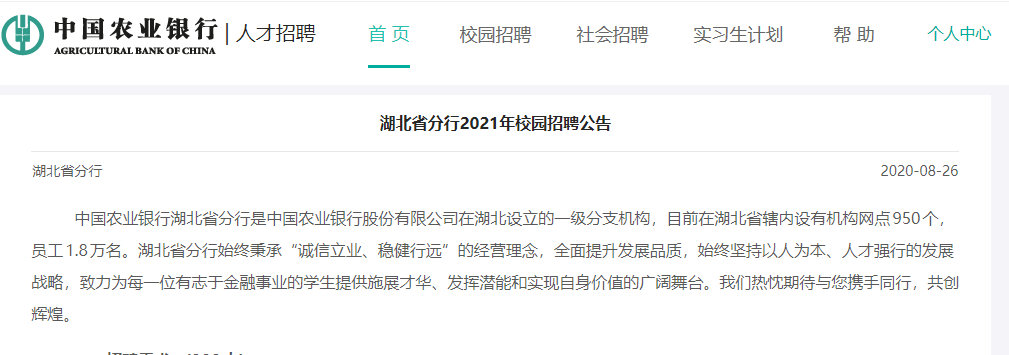 招聘900人!农业银行湖北分行公告发布 一、招聘需求 (900人) (一)省分行本部管理岗。主要为我行培养和储备战略性业务骨干和经营管理人才。本次招聘定向为省分行本部投资银行及营销管理岗和信息科技岗选拔优秀毕业生。非科技部门定岗录用人员将先安排到武汉分行锻炼2年以内。 (二)各二级分行本部管理岗。主要为我行培养和储备战略性业务骨干和经营管理人才。本次招聘定向为二级分行本部前台营销岗和信息科技岗选拔优秀毕业生。非科技部门定岗录用人员将先安排到基层网点岗位锻炼不少于1年,其中到县域或郊区支行岗位锻炼不少于6个月。 (三)通用业务岗。主要为我行培养和储备综合营销、业务运营、信息科技、财务会计、风险控制、法律合规、数据分析等专业型和管理型人才。 二、招聘条件 招聘对象以境内外高校2020年、2021年全日制大学本科及以上学历应届毕业生为主。个别地区可招聘2020年、2021年全日制大专学历应届毕业生(详见招聘岗位的职位描述)。 三、网上报名 应聘者请登录中国农业银行招聘网站(https://career.abchina.com)进行在线注册和岗位投报。报名截止时间:2020年9月25日(周五)24:00。 1361名!湖北农商行招聘面向社会招录一批新员工 一、招录岗位与名额 (一)招录岗位:柜员、客户经理、主管会计和信息科技等岗位。 (二)招录名额:1361名,其中:法律类专业267人,计算机类专业534人,其他专业560人。 二、网上报名 2020年8月25日至8月29日,考生登录湖北省人事考试网(网址:),选择“全省农商行2020年新员工招录报名入口”,注册个人基本信息,上传本人近期免冠2寸正面证件电子照片(红底、着白色上衣、照片为jpg、jpeg格式,30KB以下)后进行报名。 三、有关待遇 新招录员工属录用单位的正式合同制员工。首次签订劳动合同期限为三年,试用期为六个月,试用期间执行基本工资,试用期满经考核合格、转正后根据绩效考核计发绩效工资。按国家和省联社规定享受有关社会保险、住房公积金等各项福利,其中养老保险在省直集中缴纳。录用人员的具体工资福利待遇以劳动合同约定和各单位薪酬、绩效考核制度规定为准 。 点击查看详情>> 武昌职业学院招聘167人 因工作需要,武昌职业学院招聘工作人员167人。 一、招聘计划 二、报名方式 网上报名,请有意者将个人简历和生活照(1张)发送至邮箱:wczygbrsc@163.com,文件名以“姓名+应聘职位+薪资要求+高校人才网”命名。 点击查看详情>> 年薪10万!武汉市青山区白玉山街道招聘 一、招聘职位及人数 青山区白玉山街道“民呼我应”街道员额制工作人员2名,妇联干事1名,主要在街道从事公共管理、服务工作。 二、网上报名 应聘人员于2020年8月26日中午12:00至8月28日中午12:00期间登录武汉掌上人才网首页的“招聘·考试”页面,点击“网上报名”,选择相应公告和报考职位,填写报名信息(含上传照片,此后所用照片要求一致,未上传照片或上传照片不符合要求将不能通过审核)。应聘人员只能选择一个岗位进行报名,提交信息必须真实、准确、完整、有效,凡弄虚作假者取消应聘资格。 三、薪酬福利 “民呼我应”街道员额制工作人员职位年薪酬福利按照约10万元/人/年总额控制,实行绩效管理,涵盖五险一金等。妇联干事职位薪酬福利按照工资2750/月,购买五险一金。 点击查看详情>> 湖北省新华书店(集团)有限公司招聘工作人员 因工作需要,湖北省新华书店(集团)有限公司面向社会招聘工作人员。 一、招聘计划 (责任编辑:admin) |