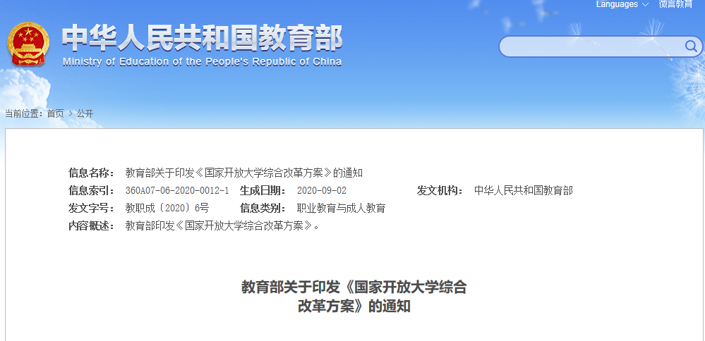 9月7日,教育部官网发布关于印发《国家开放大学综合改革方案》的通知,对整体推进新时代国家开放大学转型发展,提高办学质量,提升学校治理体系和治理能力现代化水平提出了相关要求。 点击下图查看《方案》全文 《方案》明确,将推动有关省(区、市)人民政府及新疆生产建设兵团和有关计划单列市、副省级城市人民政府(以下简称地方政府)将所属的39所省级广播电视大学统一更名为������(省域名或城市名)开放大学,规范其市州、区县分支机构名称,于2020年12月底前报教育部备案。支持更名后的39所地方开放大学发展为国家开放大学的区域中心(分校或分部),统一纳入国家开放大学办学体系。 据湖北新闻报道,该份文件中涉及到湖北的高校有湖北广播电视大学和武汉市广播电视大学。 《方案》还提出到2025年,逐步实现以下目标: ——国家开放大学的高等学校属性更加明确,新型高校内涵更加清晰,高等学校的地位依据《中华人民共和国高等教育法》等法律法规得到保障,有关办学权和办学政策得到落实,党的领导和党的建设全面加强。 ——国家开放大学的全国办学体系更加完善,省级广播电视大学转型为地方开放大学,按照“两级统筹、四级办学”体制运行,形成“全国一盘棋”的一体化办学格局。 ——实现学历教育和非学历教育并重发展,信息技术与教育教学深度融合,教育教学质量得到稳步提升,在线教育水平居于国内前列,建成技术先进、功能强大、面向全民的终身教育平台,引领“互联网+教育”又好又快发展。 (责任编辑:admin) |
