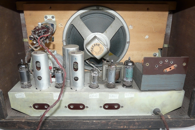 Caractéristiques du modèle H6 : Année de sortie : 1955 Lampes : 6BA7, 6BA6, 6AV6, 6AQ5, EZ80, EM34 Réglage de tonalité Pas de cadre antenne La restauration de l'électronique n'a pas posé de problème particulier. Les condensateurs de filtrage ont été changés, ainsi que le condensateur de liaison de la lampe finale, et quelques autres qui avaient mauvaise mine. Les potentiomètres et le rotacteur ont été nettoyés. Les premiers tests (avec une antenne additionnelle) ont été concluants, et le poste fonctionne vraiment bien.