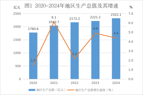 2024年是深入实施“十四五”规划的关键之年,是全市经济社会发展蓄力突破的奋进之年。全市上下坚持以习近平新时代中国特色社会主义思想为指导,全面贯彻落实党中央决策部署,紧扣铸牢中华民族共同体意识工作主线,锚定自治区“闯新路、进中游”目标,以改革创新精神办好两件大事、抓好“六个工程”,纵深推进“思想大解放、工作大提速、经济大发展”,经济社会发展迈出新步伐、取得新成效。 一、综合初步核算,2024年全市地区生产总值[2]2322.1亿元,比上年增长4.4%。其中,第一产业增加值480.3亿元,增长6.1%;第二产业增加值611.8亿元,增长6.0%;第三产业增加值1230.0亿元,增长3.1%。三次产业比例为20.7:26.3:53。人均地区生产总值达到58787元,比上年增加3047元。 年末全市常住人口393.1万人。其中,城镇人口222.8万人,乡村人口170.3万人;常住人口城镇化率56.67%,比上年增长1.1个百分点。男性人口199.3万人,女性人口193.8万人。全年出生人口2.25万人,出生率5.7‰;死亡人口3.29万人,死亡率为8.3‰。 表 1 2024年年末常住人口数及其构成