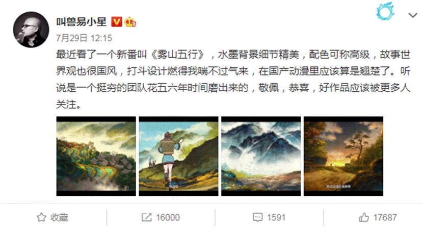 今年夏天,又有一部国漫火出圈了。 自7月26日,《雾山五行》以热血番的态势登陆B站,然后……就爆了。 上线3周,豆瓣评分依然高达9.9分。 8月9日更新最后一集后,B站播放量已突破4000万。连续B站热搜第一。 明星、大V都成了自来水。 这是一个充满侠义文化、和“五行”相关的原创故事:上古时期妖兽纵横,一位神秘道人分别授予了阴阳五行的特殊能力给金木水火土五个家族来抵抗妖兽。他们将妖兽驱赶到神隐雾山之中,设立结界。雾山之中另有强大灵力的麒麟兽常常吸引来那些想要提升妖力突破结界的妖兽们,因此自愿被封印于巨阙神盾之中。火行使者闻人翊悬为救其母私自打开了巨阙神盾,小麒麟趁机偷溜出来,妖兽界将掀起一股腥风血雨…… 讲真,前两集热血得不能再热血了,被精彩打斗吸引的小编直到第三集才静下心走进整个世界观,也才发现,水墨画风不但让打斗更有冲击力,一帧帧的水墨美景作为桌面也是美不胜收啊。 Get到了水墨画的意境。 期间,热爱二次元的小伙伴打探到,出品《雾山五行》的六道无鱼动画工作室位于“王质遇仙”传说源远流长的衢州烂柯山脚下,导演林魂是土生土长的衢州人。 (衢州烂柯山脚下,能看出《雾山五行》水墨风景的影子吗?) 拜访林导立刻安排上! 低调的林导表示,不想曝光工作室太多信息,所以只好用B站的截图以飨大伙了。 不过,林导还是很热情地提供给小编一些情报。 首先,关于第三集没有精彩的打斗 “第一集、第二集都有比较激烈的战斗,这也是我们用心设计的。但是第三集没有战斗,对于整个故事的而言,是有一些承上启下的。只喜欢看战斗,不太去理解我们故事的一些走向和内核的的观众也有,我们能理解,他们也都有自己的观看感触。” 还有关于工作地点 “我们的工作环境依山傍水,没有网上传的那么山沟沟里哦。家乡的山山水水也会带来一些灵感来源。我们衢州市区其实一直都在发展,她也能跟得上整个时代的步伐和脚步。其实我们自己团队很多人都挺喜欢在小城市的这种生活节奏,比较简单,很适合创作。” 关于制作时间 “正式的制作时间是2017年7月份,我们制作完成是2019年10月份,其实这3集我们总共花的时间是两年左右,我们在剧本、故事等等一系列前期准备上会花费很多很多的心思做设计。” 关于第二季 “我们现在正在做的后续篇章,也是之前我们就已经设计好的,所以说不会受道特别大的影响。下一季我们肯定会拼尽全力去制作,至于什么时候能做出来,其实我们心里还是个未知数,也希望到时候工作室的团队能能够更稳定一些,大家的能力会越来越进步,自然而然就也能制作得更快一些吧。” |