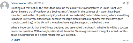 Shrekll回复TheLibrarianApe:空客是一家集欧洲多国之力建立的公司,空客的飞机也是多国合作生产的。今天已经很少有产品纯粹是一个国家生产的了。无论直接还是间接,各个零部件来自世界各地。像特朗普和玛丽娜·勒庞那样的民族主义白痴对此根本一无所知(要不就是他们有意误导自己的支持者)。 karpouzi:又一个中国的面子工程,为了抚平他们的“百年屈辱”,他们不过是在用这架飞机粉饰自己的失败罢了。 Alex Wijaya回复karpouzi:面子工程?产业界预测未来几十年中国将需要数千架飞机,你以为中国会傻到让外国制造商分食中国国内那么大的市场吗? Tannin回复karpouzi:你的话毫无道理。中国人并不指望这架飞机能与空客或波音的产品一较高下,也不指望靠卖这架飞机赚钱,他们从没这么想过。中国人认为这不过是与波音空客同台竞技漫长而且耗资巨大的征程的第一步,也许最终中国人将击败那两家公司。中国人非常清楚,要想赶上目前两家市场领袖还需要几十年时间,这架飞机本身可能不会大获成功,但他们已经下定决心付出必要的时间、努力和资金。空客本身也是从上世纪70年代开始,花了30多年才追上麦道、洛克希德和波音这些公司成为世界第一的。中国也是下定了这个决心,要用几十年艰苦的努力赶上并最终击败欧洲和美国同行。这根本不是秘密:中国人并没有隐瞒自己的意图,他们很多年以前就这样说过。 Tom Lowe:又来了,小编就不能好好祝贺一下中国的好消息吗?总是忘不了那些不必要的用词:“担负政治使命”、“中国称这是一架国产飞机,这种说法是有问题的”、“爱国主义”、“共产党”……要是空客或波音推出了新飞机,你还会用这些说法吗? OpinionMinnion回复Tom Lowe:欢迎阅读毫无偏见的著名英国媒体! George Silversurfer:看来他们的下一步是将发动机和航电设备这些关键分系统国产化。 CK Wunch:干得好,中国。你已经利用全世界的零部件拼出了一架飞机,不过这到底是你自己拼出来的,下一步就是生产了,然后低价销售。 Floppy1000回复CK Wunch:傻瓜,波音和 空客也是这么干的,他们也从世界各地采购各种部件。中国人很聪明,从成本效益考虑,重新发明轮胎毫无意义。如果他们能用同样的零部件装配出一架飞机,而成本只有其他竞争者的一半,那他们就已经赢了,即使在他们国内市场也是如此。 Chin Koon Siang:去这个网站看看美国波音787梦幻客机的分包商?IR=T&r=US&IR=T 发动机 - 英国 机翼 - 日本 起落架 - 法国 水平稳定仪 - 意大利 翼梢 - 韩国 phil49回复Chin Koon Siang:说的不错!即使汽车制造行业也很难说什么是“国产”的了。我理解中国人在C919里面的民族自豪感,我希望日后民族自豪感得以恢复之后,民族主义情绪降温,那时才是真正合作的开始。 Schnellmann:指出“并非飞机上的所有部件都是中国生产”这一点并不明智。如果你看一眼美国波音飞机,其实也不是每个部分都是美国制造的。实际上,现在确定一个产品是哪里制造已经非常困难了,比如说英国可以造飞机的发动机,但这个发动机本身内部的很多部件也是全球采购的。这条新闻的重要意义在于,中国人自己设计并装配了这架飞机,成功与否是另一个问题。如果中国政府给予足够支持,它就能成功。也许C919是中国人研发的更先进机型推出前的探路者。 sokkynick:空客和波音20年后可能会被挤出中国市场。 Helice回复sokkynick:不一定。中国汽车市场上也不是只有中国车。 (责任编辑:admin) |