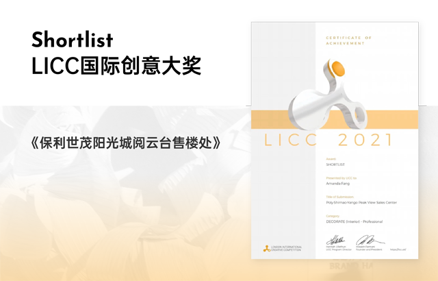 近日,全球指标性设计赛事LICC伦敦国际创意大赛在十分激烈的竞争下诞生新一届获奖名单。凭借对设计创意的锐意追求,AVAD范可萨设计作品【保利世茂阳光城阅云台售楼处】斩获LICC国际创意大奖,【重庆金茂礼嘉樾千山】、【弘阳·淮安泓著大观花苑】也双双入围。